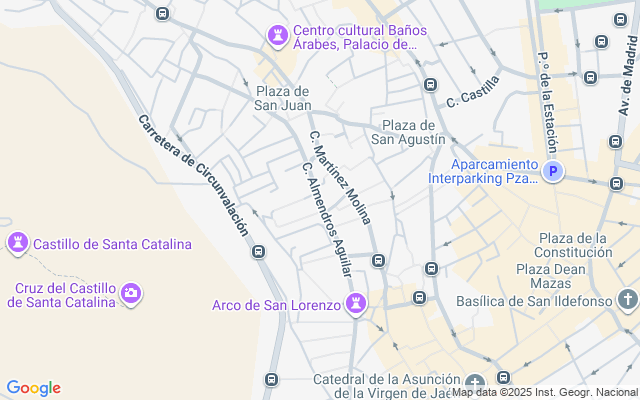 Se alza al pie del cerro de Santa Catalina, con calles empinadas y de pronunciadas pendientes que definen su urbanismo, ensanchándose hacia las zonas más llanas y amplias de los nuevos barrios y bulevares. En sus alrededores abundan fértiles tierras de cultivo, y extensos olivares que cubren gran parte de su término. Hacia el sur y el sureste se encuentran las sierras de Jaén y Jabalcuz, y al norte se abre el llano del río Guadalbullón, que pasa a muy corta distancia de la ciudad.