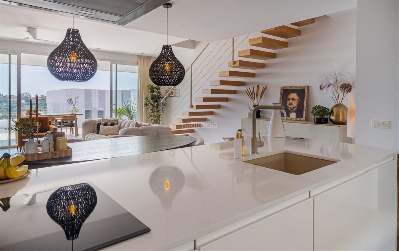 La vivienda se distribuye en dos plantas más un magnífico solárium privado. Se accede por un encantador sendero ajardinado. Al entrar, se aprecia de inmediato la luz natural y la amplitud del espacio. La cocina, el comedor y el salón están integrados en un único ambiente, con salida a una terraza suspendida y cubierta con toldo automático. La cocina está totalmente equipada con electrodomésticos Bosch de alta gama y cuenta con una elegante isla con barra desayunadora. Las vistas desde la cocina, el salón y la terraza son simplemente espectaculares. En esta planta también hay un aseo de invitados y una práctica zona de lavandería, inteligentemente separada de las áreas sociales.