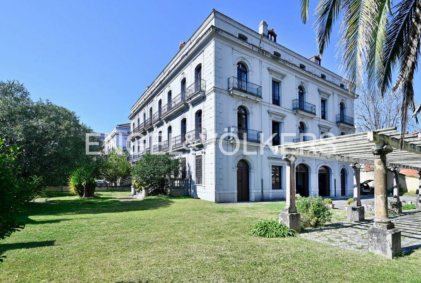 Su imponente fachada de estilo ecléctico, equilibrada y elegante, destaca por los balcones de hierro forjado, los vanos en arco con molduras clásicas y una distinguida galería acristalada en esquina que aporta luminosidad y personalidad a las plantas principales. La simetría arquitectónica y la nobleza de sus proporciones le otorgan una presencia atemporal. Tras la verja de hierro forjado se abre un jardín privado poco habitual en pleno centro urbano: amplias zonas de césped, palmeras de gran porte, arbolado escultórico y una pérgola que invita a imaginar recepciones al aire libre, eventos exclusivos o momentos de tranquilidad.