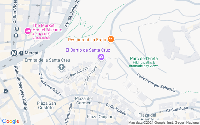 En la zona baja del barrio de Santa Cruz te encuentras con el Casco antiguo de Alicante, algo maravilloso de esta zona son su magníficos miradores que encontrarás en su recorrido, además posee dos sitios emblemáticos de la ciudad de Alicante, La Ermita de Santa Cruz y la Hermandad de Santa Cruz.