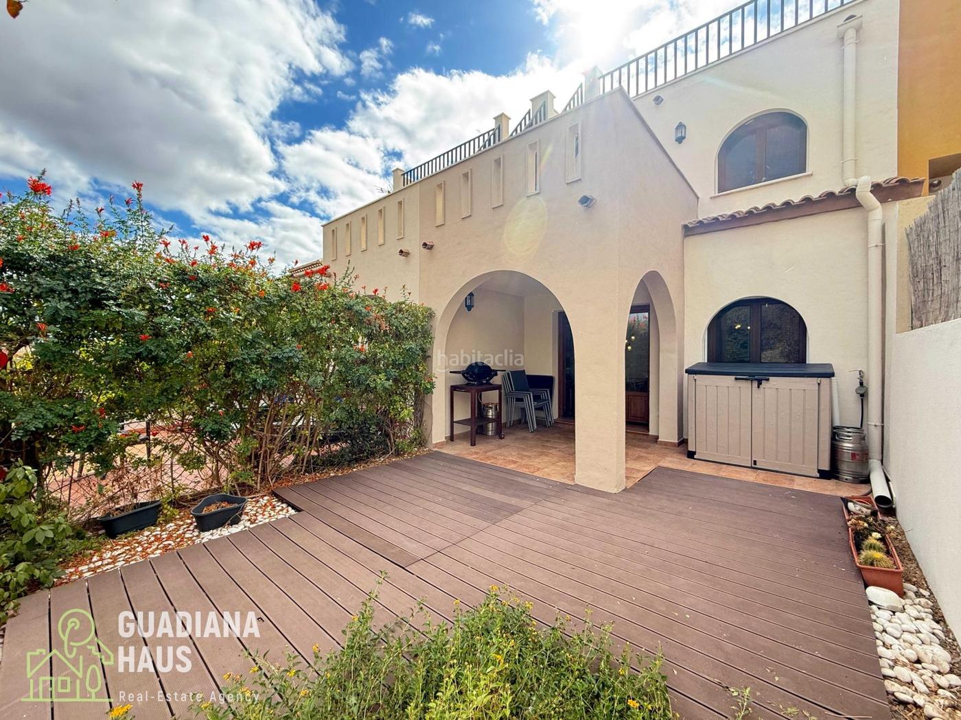 Dispone de jardín losado orientado al este de unos 40 m² en la parte trasera, con posibilidad de abrir un acceso directo a las zonas comunes y la piscina, además de un pequeño porche delantero por el cual se accede a la casa.