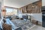 El apartamento cuenta con un dormitorio doble con armarios empotrados, un baño moderno, una amplia sala de estar y una cocina totalmente equipada con lavadora, microondas y nevera. Grandes ventanales llenan el salón de luz natural, creando un espacio luminoso y agradable.