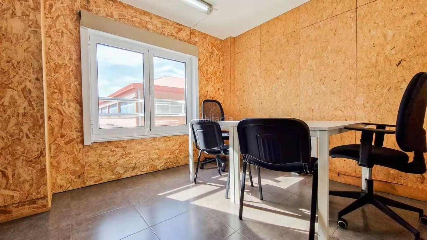 Oficina luminosa y funcional con dos mesas, armario, baldas y pequeño office. Espacio equipado y listo para trabajar, con limpieza regular e iluminación natural.