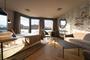 Amplio estudio, amueblado con una cama-canapé, sofá, sillón, TV, una mesa de comedor con dos sillas y elegantes estanterías. Dispone de un balcón soleado con vistas al oeste y ventanas de doble acristalado equipadas de persianas y toldos. La cocina abierta está reformada a estrenar y está equipada con placa de inducción, microondas, campana extractora, nevera pequeña y lavadora secadora.