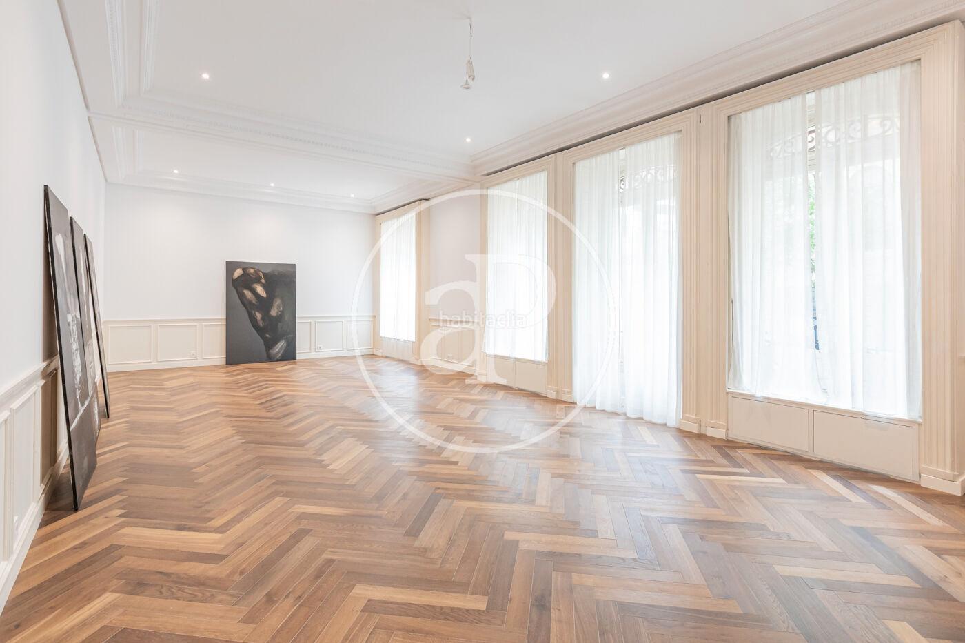 Con una superficie de 330 m² construidos y 215 m² útiles, se encuentra en una primera planta de un edificio histórico que conserva detalles de la época, como sus techos altos y molduras decorativas, lo que confiere un carácter único a cada uno de sus espacios.