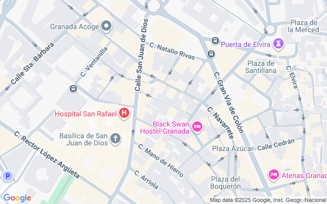 Se encuentra en la zona de San Juan de Dios, un barrio muy tranquilo, céntrico, con todo tipo de comercio cercano, supermercados, cafeterías, y transporte que comunica con toda la capital, justo al lado de la facultad de derecho y de la de ciencias. Pleno centro.